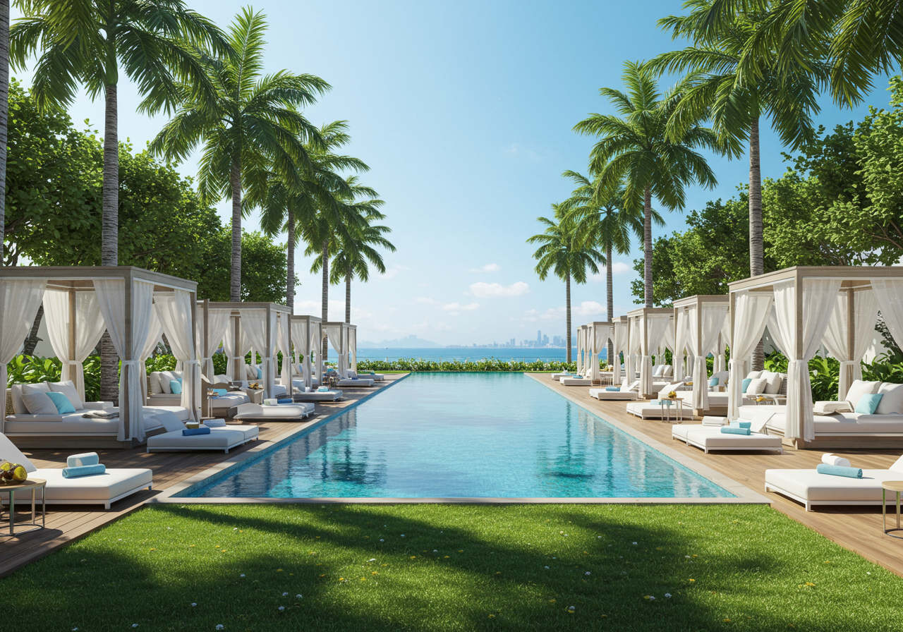 The property boasts an array of social spaces that encourage community and connection. The pool deck and lounge area, with dedicated food and beverage service, offer a chic setting for soaking up the Miami sun. For moments of quiet reflection or social gatherings, the Social Lounge, Library Lounge, and private dining room with stunning views of the Miami skyline provide the perfect backdrop.