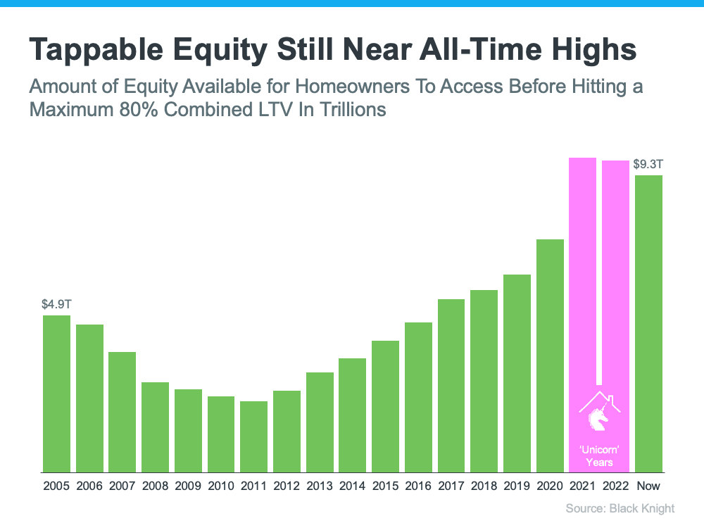 Although the headlines focus on the slight dip in homeowner equity over the past year (0.7% according to CoreLogic), they fail to present the complete picture. While the depreciation of home prices in the latter half of the previous year led to a decrease in equity, the data reveals that homeowners still possess near-record levels of equity. A visual representation of tappable equity demonstrates this fact, showcasing a significant boost during the "unicorn" years and illustrating that total homeowner equity remains significantly higher than pre-"unicorn" levels.